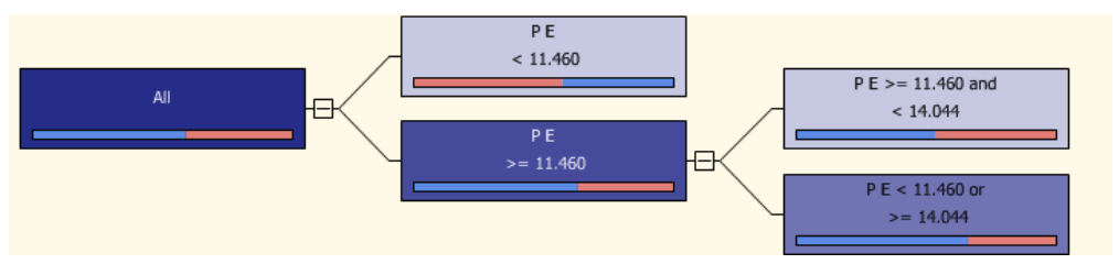 The Decision Tree model confirmed the importance of the P/E ratio. When the P/E ratio was below 11.46, more than half of the stocks decreased in price. When the P/E ratio was 14 or higher, stocks were much more likely to increase in price.