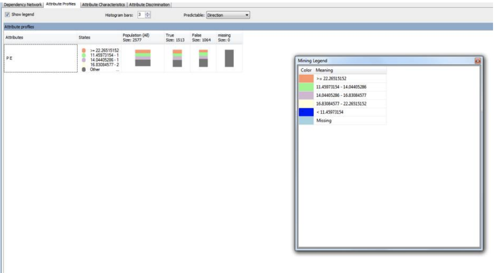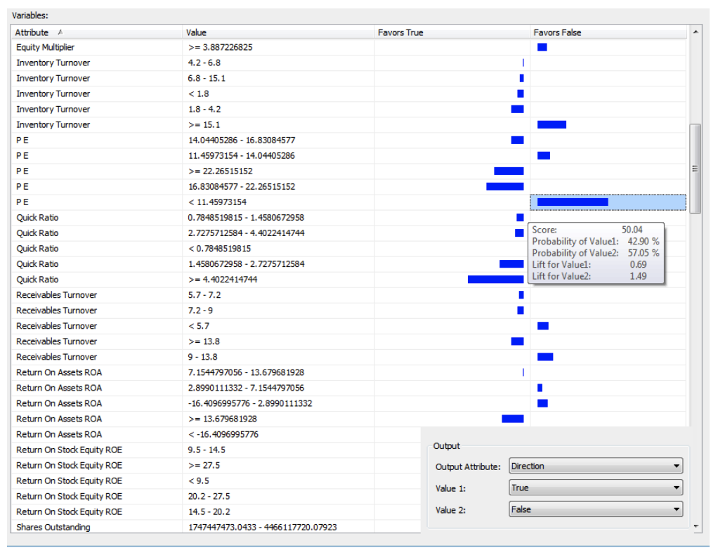 The Neural Network model calculated probabilities for each variable and its significance. For example, when the P/E ratio was below 14, the model predicted stock price decline in 57% of cases.